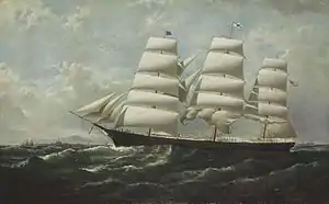 Details of her time between 1870 and 1885 are incomplete, but she "ran between New York and British ports and San Francisco almost exclusively" during those years.[1] She did make a fast voyage from New York to San Francisco between October 13, 1873 and mid-January, 1874 (see the table and note). In 1875 she set the record of 35 days for a passage from San Francisco to Sydney, Australia. According to McKay,[1] until 1885 under Captain McLaughlin Glory carried general cargo from New York to San Francisco and wheat from there to Britain, and was nearly wrecked in a storm when arriving in Britain in 1880. The Bruzelius timetable[2] (below) differs and does not mention the 1880 event. Both agree that she was laid up at San Francisco between December 1882 and February 1885.