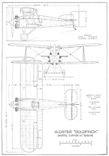 In January 1926 the Air Ministry funded Gloster Aircraft to produce an all-metal version of their Gamecock for a high altitude fighter role, hence requiring a supercharged engine. The result was the Goldfinch, a single-bay biplane with unequal span wings of marked stagger. Unsurprisingly, this aircraft had a strong similarity to the Gamecock and in particular to the Gamecock II with its narrow-chord ailerons. Because of the supercharged engine the fuselage was longer forward of the cockpit. The tail also was slightly different, the tailplane having rounded trailing tips and the fin, initially, was very broad in chord and short in height.[1][2]