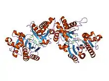 - ↑ Kohls D, Sulea T, Purisima EO, MacKenzie RE, Vrielink A (January 2000). "The crystal structure of the formiminotransferase domain of formiminotransferase-cyclodeaminase: implications for substrate channeling in a bifunctional enzyme". Structure. 8 (1): 35–46. doi:10.1016/S0969-2126(00)00078-2. PMID 10673422.