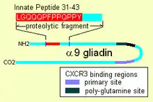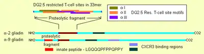 {{cite journal}}: CS1 maint: multiple names: authors list (link) - ↑ 1 "α-I" site, 3 "α-II" sites, and 2 "α-III" sites, Qiao SW, Bergseng E, Molberg Ø; et al. (August 2004). "Antigen presentation to celiac lesion-derived T cells of a 33-mer gliadin peptide naturally formed by gastrointestinal digestion". J. Immunol. 173 (3): 1757–62. doi:10.4049/jimmunol.173.3.1757. PMID 15265905.
