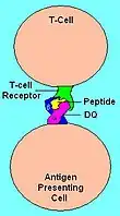 | Illustration of HLA-DQ with peptide in the binding pocket | HLA DQ Receptor with bound peptide and TCR |