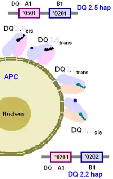 - ↑ HLA-DQ8 generally refers to DQ8.1, DQA1*0301:DQB1*0302 but DQA1*0301 and DQA1*0303 can produce the same functional isoform, rarely DQA1*0503 is in the DQ8 haplotype, it has no known association with disease