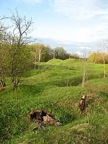 The archaeological site comprises a "citadel" (gorodishche) (Russian: Городище), formerly situated at the confluence of the Rivers Dnieper and Svinets, and a ring of ancient rural settlements (selitba) which occupy an area of 17.5 hectares, of which roughly 5,000 square metres (54,000 sq ft) had been excavated by the end of the 20th century. This makes the site one of the largest survivals of the Viking Age in Europe: only Hedeby covered a larger territory (24 hectares), with the sites of Birka (13 hectares), Dublin (12 hectares), Ribe (10 hectares), and Gdańsk (1 hectare) trailing behind.[1] There are about 3,000 burial mounds[2] arranged in eight clusters of kurgans. Of these, about 1,300 mounds have been explored by Russian and Soviet archaeologists, starting in 1874.