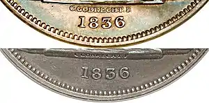 When the full-scale production began, the reverse eagle was surrounded by 26 stars rather than 24 as Patterson had originally requested of Sully, as the states of Arkansas and Michigan had been admitted to the Union since Patterson's letter was penned in 1835. Some of the Gobrecht dollars produced were struck with 'medal alignment', meaning that the obverse and reverse images both face upward when the coin is rotated around its vertical axis.[15] For the 1837 production (which kept the 1836 date), Patterson ordered that the coins be struck in coin alignment, the opposite of medal alignment, and the practice with current US coins (the two faces both are upright when the coin is rotated about its horizontal axis).[15] An act of January 18, 1837, officially changed the legal standard for silver coins from 89.2%[16] to 90% silver.[17] Numismatic historian Walter Breen asserts that those pieces struck before the passage of this act are technically patterns (or coins created to test their design, composition or other points), as they were not authorized by Congress.[18] In total, 1,000 pieces dated 1836 were struck in 89.2% silver and 600 in 90% silver.[16] Gobrecht dollars struck prior to passage of the act weighed 26.96 grams (0.951 oz), while those struck later weighed 26.73 grams (0.943 oz).[16]