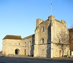 The original gatehouse was a simple affair, built in the late 13th century and known as the Saltmarsh Gate, as it led to marshlands outside the town.[1][2] Being close to God's House Hospital, which had been founded in 1168 by Gervase le Riche as a refuge for travellers, the gateway became known as the God's House gateway.[3] Following the French raid on the town in 1338, the town's defences were strengthened and the gateway was reinforced.[3]