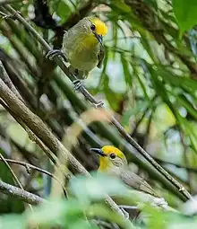 The golden-crowned babbler (Sterrhoptilus dennistouni) is a species of bird in the family Zosteropidae. It is endemic to the Philippines only being found in the moist tropical forest in Northern Luzon. It is threatened by habitat loss.