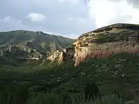 The park is 320 km (200 mi) from Johannesburg and is close to the villages of Clarens and Kestell, in the upper regions of the Little Caledon River.[4] The park is situated in the Rooiberge of the eastern Free State, in the foothills of the Maluti Mountains. The Caledon River forms the southern boundary of the park, as well as the border between the Free State and Lesotho. The elevation ranges from a 1,800 m (5,900 ft) plateau in the north to heights of 2,700 m (8,900 ft) in the south.[9] The highest peak in the park (and also in the Free State) is Ribbokkop at 2,829 m (9,281 ft) above sea level.[6]