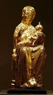The Golden Madonna of Essen is a sculpture of the Virgin Mary and the infant Jesus. It is a wooden core covered with sheets of thin gold leaf. The piece is part of the treasury of Essen Cathedral, formerly the church of Essen Abbey, in North Rhine-Westphalia, Germany, and is kept on display at the cathedral.