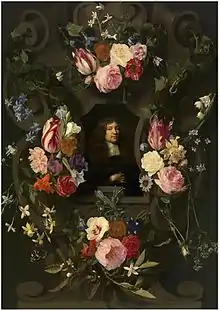Coques occasionally worked on garland paintings in which he painted the staffage and the flower or fruit garland was painted by other artists. Garland paintings typically show a flower or fruit garland around a devotional image, portrait or other religious symbol (such as the host).[12] Garland paintings were developed in Antwerp in the early 17th century as a special type of still life by the artists Jan Brueghel the Elder and Hendrick van Balen at the request of the Italian cardinal Federico Borromeo.[12][15] Other artists involved in the early development of the genre included Andries Daniels, Peter Paul Rubens and Daniel Seghers. The genre was initially connected to the visual imagery of the Counter-Reformation movement.[15] It was further inspired by the cult of veneration and devotion to Mary prevalent at the Habsburg court (then the rulers over the Southern Netherlands) and in Antwerp generally.[12][15]