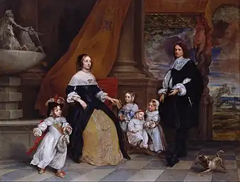 His family portraits are never stereotypes although his clients may have been able to choose from models. This explains that identical poses appear in a series of diverse pictures. Still each background is different.[3] A good example of a family portrait is the composition A family group in a landscape (Wallace Collection). It shows the father of the family decorously holding his wife's hand while pointing with his other hand to his sons returning from the hunt. The image conveys the privileged position of the family members since hunting had been until shortly before the date of the painting the exclusive privilege of the nobility. A daughter accompanies the boys. The basket of fruit she carries may be a representation of the hope for a fruitful marriage.[9] The well-tended garden is decorated with statuary and fountains and is a testimony to the sitters' status and wealth. The family hierarchy is clearly staged, but the setting remains informal because of the presence of children and pets.[3] The background in this painting may have been painted by another hand.[9]