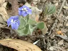 Goodenia katabudjar is a species of flowering plant in the family Goodeniaceae and is endemic to a restricted area in the south-west of Western Australia. It is a hairy perennial sub-shrub with egg-shaped stem-leaves and blue, pink or white flowers.