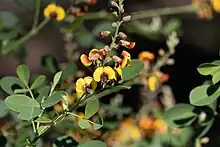 Goodia medicaginea, commonly known as western golden tip,[2] is a species of flowering plant in the family Fabaceae and is endemic to southern continental Australia. It is a shrub with trifoliate leaves, the leaflets narrowly egg-shaped with the narrower end towards the base, and mostly yellow, pea-like flowers with red to purplish-black or brown markings.