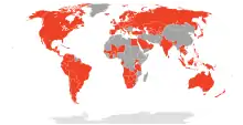 The full country list includes: Albania, Angola, Antigua and Barbuda, Argentina, Armenia, Aruba, Australia, Austria, Azerbaijan, Bahrain, Belarus, Belgium, Belize, Benin, Bolivia, Bosnia-Herzegovina, Botswana, Brazil, Burkina Faso, Cambodia, Canada, Cape Verde, Chile, Colombia, Costa Rica, Croatia, Cyprus, Czech Republic, Denmark, Dominican Republic, Ecuador, Egypt, El Salvador, Estonia, Finland, Fiji, France, Gabon, Germany, Greece, Guatemala, Haiti, Honduras, Hong Kong, Hungary, Iceland, India, Indonesia, Ireland, Italy, Ivory Coast, Jamaica, Japan, Jordan, Kazakhstan, Kyrgyzstan, Kuwait, Lao People's Democratic Republic, Latvia, Lebanon, Lithuania, Luxembourg, Macedonia, Malaysia, Mali, Malta, Mauritius, Mexico, Moldova, Namibia, Netherlands, Nepal, New Zealand, Nicaragua, Niger, Norway, Oman, Panama, Papua New Guinea, Paraguay, Peru, Philippines, Poland, Portugal, Qatar, Rwanda, Russia, Saudi Arabia, Senegal, Singapore, Slovakia, Slovenia, South Africa, South Korea, Spain, Sri Lanka, Sweden, Switzerland, Taiwan, Tajikistan, Tanzania, Thailand, Togo, Trinidad and Tobago, Turkey, Turkmenistan, Uganda, Ukraine, United Arab Emirates, the United Kingdom, the United States, Uruguay, Uzbekistan, Venezuela, Vietnam, Zambia, Zimbabwe [5]