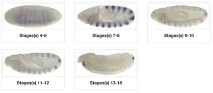 Drosophila embryos show developmental stage-dependent expression of gsb.[9] This was determined by in situ hybridization gsb mRNA with a purple probe, allowing visualization of the gene expression.