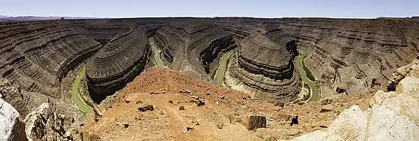 Goosenecks State Park is a state park in the U.S. state of Utah, overlooking a deep meander of the San Juan River. The park is located near the southern border of the state a short distance from Mexican Hat, Utah.[1] Millions of years ago, the Monument Upwarp forced the river to carve incised meanders over 1,000 feet (300 m) deep as the surrounding landscape slowly rose in elevation. Eroded by water, wind, frost, and gravity, this is a classic location for observing incised meanders.