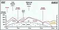 The canyon starts off at Guillaumes, running north to south, west of the Dôme de Barrot, and ends at the small commune of Daluis, where the Var widens. The 6-kilometer-long gorge[1] is cut in the red rock (sandstone colored by iron oxide, 260 million years old)[2] by the river Var. Notable views along the gorge (a touristic high point[2] and one of a number of "long, lonely canyons" in the area)[3] include the final waterfall of the Clue d'Amen.[4]