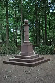 Also nearby was the 'Landgrafensäule' or 'Landgraf column', erected in 1816 on what later became the visual axis from the Gothic House to the Elisabethenschneise, which in turn leads to the Hirschgarten. The original column was moved to the castle in 1835, but a replica was built near its site in 2011.[1] The replica and original both bear an inscription, which translates as: