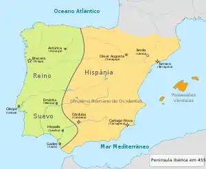 In 448 Rechila was succeeded by his son Rechiar who was at least as warlike. At the beginning of his reign, he had the comes Hispanae Censorius, who was imprisoned in Seville, murdered. He plundered the Ebro Valley and sought rapprochement with the Bagaudae who were active here.[7] Later in 449 he went on a diplomatic mission to Toulouse, where Theodoric I, his father-in-law and Roman ally sat.[8] On his return journey, Rechiar made an alliance with Basilius, the leader of the Bagaudae, and again went through the Ebro Valley, where he attacked Caesareas Augusta and took the city Lleida.[9] He took many prisoners, but failed to take the province and thus complete the Suevi conquest of Spain.