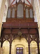 This was Bach's first cantata for festive orchestra, including trumpets and timpani. The instruments are divided into four spatially separated "choirs", placing the work in the polychoral tradition associated with composers such as Heinrich Schütz.[13] The instruments required for the Baroque instrumental ensemble are three trumpets (Tr), timpani (Ti), two recorders (Fl), two oboes (Ob), bassoon (Fg), organ obbligato (Org), two violins (Vl), viola (Va), violoncello (Vc), viola da gamba (Vg) and basso continuo.[14]