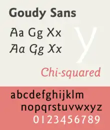 Unlike many sans-serifs, which often have an unadorned appearance with a geometric or industrial aesthetic, Goudy Sans has a more organic and decorative structure resembling painted lettering, with flared stroke ends and an avoidance of straight lines, typifying Goudy's taste towards designs with an organic feel.[6][7][8][9] Goudy added several complementary decorative alternate characters.[10] Goudy drew a complementary italic with letterforms inspired by handwriting, decorative features such as swashes and curls, again with a number of decorative alternates.[11][12] Lewis Blackwell in 20th-Century Type describes it as "something of a sport...with pronounced tendency to the inscriptional in its 'chiselled' junctions".[13] The proportions of the lower-case are slightly condensed.[9][14]