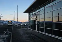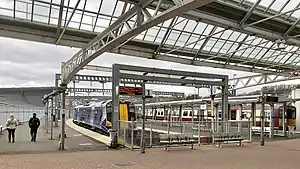 Station buildings seen from platform 1, with a Class 385 train in service.