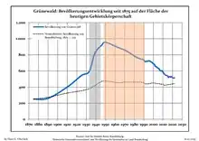 Development of Population since 1875 within the Current Boundaries (Blue Line: Population; Dotted Line: Comparison to Population Development of Brandenburg state; Grey Background: Time of Nazi rule; Red Background: Time of Communist rule)