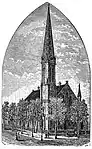 The church building was designed by architect Richard Upjohn and built in 1845–46, when the area had a much more residential character. It is a relatively simple expression of Gothic Revival architecture, and is notable as the first building in which Upjohn used asymmetry in a church's massing.[3] In 1912, Cram, Goodhue & Ferguson added a parish house[4] which connects with the church through several narrow, twisting stairwells and passages.[5] The parish house was remodeled and enlarged in 1950 by Harkness & Geddes.[4]