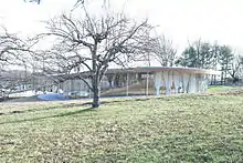 Opened in 2015, the River building was designed by the Japanese architectural firm SANAA, led by Kazuyo Sejima and Ryue Nishizawa.[10][11] The porous design of Grace Farms and the River building was meant to inspire and break down barriers between people and nature. Natural light flows through more than 200 floor-to-ceiling glass panels in the River building, generating 360-degree views of the landscape in the changing seasons. The undulating pathways under a curvilinear roof follow the flow and elevation of the land. The River building has been honored nationally and internationally with numerous prestigious design awards.