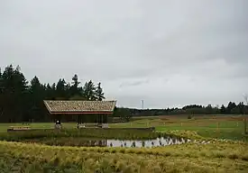 Other features include a parking lot, restroom, picnic shelter, stone acorn sculpted by Mauricio Saldana.[1] The picnic shelter features a green roof that includes plants, while the restroom includes solar panels on the roof.[2] Additional environmentally friendly items at the park include bioswales, pervious pavement, and LED lighting.[2] There are also overlooks and signs, with the signs provided by the Confederated Tribes of the Grand Ronde.[2] That tribe includes the Kalapuyan tribes who once inhabited the area.