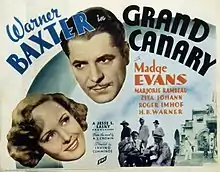 Grand Canary is a 1934 American drama film directed by Irving Cummings and starring Warner Baxter, Madge Evans and Marjorie Rambeau.[1] It is an adaptation of A. J. Cronin's 1933 novel of the same title.[2]