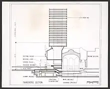 In February 1968, six months after Grand Central Terminal was landmarked, plans were announced for a tower over the terminal, to be designed by Marcel Breuer.[23] With a proposed height of 950 feet (290 m), the tower would have stood 150 feet (46 m) taller than the Pan Am Building, and its footprint would have measured 309 by 152 feet (94 by 46 m), the same size as the Main Concourse. The tower would have spared the Main Concourse, using the existing building's support structure and four huge trusses to cantilever over the concourse, but the southern third of the terminal would have been destroyed to make way for elevator lobbies and a taxi drop-off area.[24] The Pershing Square Viaduct would also be partially demolished to make way for a modern freeway.