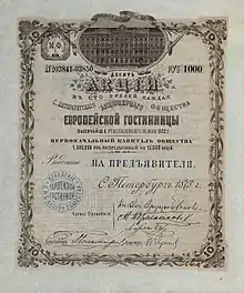 Share of the St. Petersburg company "Hotel Europe", issued 1873