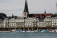 The Grand Hotel National is a 5-star hotel in Lucerne, Switzerland, which opened in 1870. Located on the shores of Lake Lucerne, it looks out over Lucerne bay and the Alps of Central Switzerland. It offers 41 rooms and suites as well as 22 residence suites, plus four restaurants, a café and a bar. In terms of its fabric and architecture, the hotel has been designated a cultural monument of national importance, with a Category A heritage protection listing.[1]