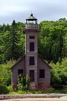 The Grand Island East Channel Light is a lighthouse located just north of Munising, Michigan and was intended to lead boats from Lake Superior through the channel east of Grand Island into the Munising Harbor. Constructed of wood, the light first opened for service in 1868. The light was very hard to see from Lake Superior, and light maintenance was very difficult so the Munising Range Lights were constructed (Munising Rear Range Light, Munising Front Range Light) and this light was removed from service in 1908[1] or 1913[5][6] (sources vary).