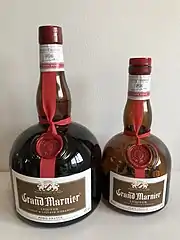 Grand Marnier (French pronunciation: [ɡʁɑ̃ maʁnje]) is a French brand of liqueurs. The brand's best-known product is Grand Marnier Cordon Rouge, an orange-flavored liqueur created in 1880 by Alexandre Marnier-Lapostolle. It is made from a blend of Cognac brandy, distilled essence of bitter orange, and sugar, containing 40% alcohol (70 proof in the UK, 80 proof in the US).[1][2] It is commonly consumed "neat" as a cordial or a digestif, and can be used in mixed drinks and desserts. Popular examples of the latter include crêpes Suzette and crêpes au Grand Marnier.