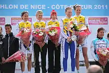 Poissy Triathlon (Andrea Hewitt, Carole Peon, Kathrin Muller, Jessica Harrison, Berengere Abraham) with the gold medal in Nice, 2011