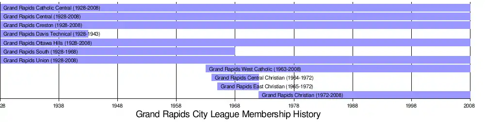 The Grand Rapids City League's last competitions were held in the 2007-2008 school year. The league's member schools joined the Ottawa-Kent Conference prior to the 2008-2009 school year.