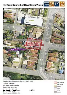 1. 1 2 3 4 5 6 7 8 9 10 11 12 13 14 15 16 17 18 19 20 21 22 23 24 25 26 27 28 29 30 31 32 33 34 35 36 37 38 39 40 41 42 "Granville Town Hall". New South Wales State Heritage Register. Department of Planning & Environment. H01679. Retrieved 2 June 2018. Text is licensed by State of New South Wales (Department of Planning and Environment) under CC-BY 4.0 licence.