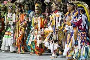 The grass dance or Omaha dance is a style of modern Native American men's pow wow dancing originating in the warrior societies on the Northern Great Plains.[1] Unlike most forms of pow wow dancing, the grass dance regalia generally has no feathers besides the occasional roach feather. The regalia consists of brightly colored fringe made of either yarn, broadcloth, or ribbon.
