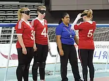 #5 Anna Sharkey having eyeshades inspected, watched by #4 Georgina Bullen and #3, at the IBSA World Games, Seoul, South Korea (May 2015).