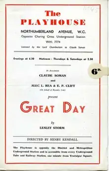 Great Day is a 1945 play by the British writer Lesley Storm. It portrays the excitement generated in an English village by the upcoming visit of American First Lady Eleanor Roosevelt.