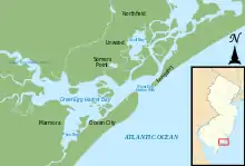 At the head of the Great Egg Harbor Bay, the Great Egg Harbor River joins the Middle and Tuckahoe Rivers between Upper Township and Egg Harbor Township. The bay is part of New Jersey's backbarrier lagoon system.[2] The bay exists as a drowned, or submerged, river valley. The waterway covers an area of 8.5 sq mi (22 km2), measuring 5.0 mi (8 km) along the coast, and extending 2.8 mi (4.5 km) inland. The tidal range varies from a 5.0 ft (1.52 m) spring tide to a 2.3 ft (0.7 m) neap tide.[19] Coastal storms can cause extreme tidal variations.[20] The bay has a salinity between 17 and 32 ppt (parts per thousand), classified as polyhaline. The tidal circulation of the bay is counterclockwise, fed by the deep channels.[19] The quality of the water is good, despite nearby urban development and dissolved oxygen. Stormwater drains in nearby Ocean City feed directly into the bay.[20]
