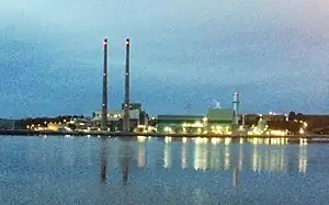 Great Island Power Station is a gas fired and former heavy fuel oil fired power station situated near Waterford Harbour in Great Island, County Wexford, Ireland, that supplies electricity to more than 500,000 Irish homes. It is located at the confluence of the rivers Barrow and Suir, near Campile. The station opened in 1967 and was operated by the Electricity Supply Board (ESB) with three heavy fuel oil units and a total power of 240 MW since 1972. The station was scheduled to close by 2010,[1][2] until it was sold to Endesa in January 2009.[3] In October 2012, the plant was acquired by SSE Thermal.
