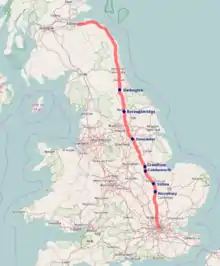 When the General Post Office at St Martin's-le-Grand, in the historic Aldersgate ward, was built in 1829, coaches started using an alternative route, now the modern A1 road, beginning at the Post Office and following Aldersgate Street and Goswell Road before joining the old route close to the Angel. The Angel Inn itself was an important staging post.[6] From Highgate the original route is bypassed and is now called the A1000 road through Barnet to Hatfield. From there it largely followed the course of the current B197 road through Stevenage to Baldock.[7] Roughly taking the route of the A1, the next stages were Biggleswade and Alconbury, again replete with traditional coaching inns.
