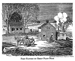 The original Mallory Hat Company, which would become one of Danbury's most prominent hat manufacturers, was established in Great Plain in 1823.[3] At this time, Danbury was in the early stages of becoming the "Hat City of the World" [4] The small shop operated at Great Plain until the 1850s, when Mallory decided to relocate downtown.[5]