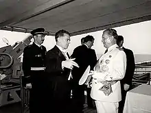 Yugoslav Ambassador to Greece Radoš Jovanović and President Josip Broz Tito at Yugoslav training ship Galeb in 1954.