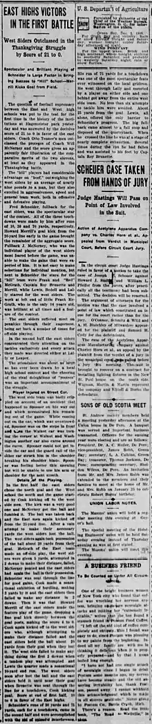 The first official meeting occurred on November 30, 1905, at Green Bay's Hagemeister Park. East won 21–0, with some later sources claiming the score was 22–0.[3] According to Christl, attendance at the first game was between 100 and 500 spectators.[5] The following year, amidst a nationwide outcry against the violent nature of football, Green Bay's school board dissolved the programs at both schools. Though they would later reverse the decision, only East fielded a team that year and the game was not played.[5] The series resumed in 1907 and continued uninterrupted. Once the series continued as a regular event, it became "a homecoming of sorts for college students who attended the two high schools."[5] Beginning in 1908, the games were relegated to the city's disused minor league baseball field at Hagemeister, known as the League Ball Grounds. Despite fears of the series' cancellation due to fights during and after the 1908 game, the series continued and West won its first game in 1909. West would then win seven straight games until East, with the aid of Curly Lambeau (who would help found the Green Bay Packers three years later), won the 1916 game.[6] Despite fears that the 1918 game would be cancelled due to the Spanish flu (and indeed it was postponed three times), the series continued.[7]