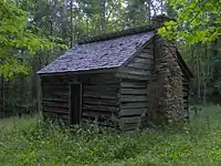 The cabin is a single-pen cabin built of chestnut logs, and measures 16 feet (4.9 m) by 18 feet (5.5 m). The interior included a puncheon-log floor and a loft, and a "tater hole" (a kind of small root cellar) near the fireplace. The front and back walls both have doors, although the cabin has no windows. An 8-foot (2.4 m) by 18-foot (5.5 m) lean-to kitchen was once attached to the west wall but has been removed. The cabin's chimney is made of stone and mud.[38]