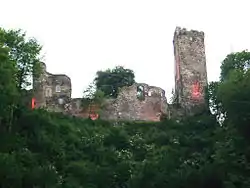 The spur castle has two baileys: an inner ward forming the heart of the fortification, and an outer ward to the west. On the south side is an outwork (Bollwerk), built around 1540, with a round battery tower (Geschützturm) and two flanking walls (Flügelmauern), the whole separated from the enceinte by a neck ditch. The triangular, mid-13th century bergfried, 32 metres (105 ft) high, stands above the northern neck ditch. All that survives from the 14th century is the gatehouse, flanked by a round tower (tourelle), on the south side of the former enceinte. On the west side, the ruins of the palas can still be made out.