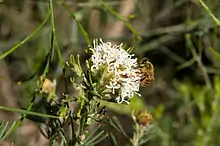 Grevillea crithmifolia is a dense shrub that typically grows to a height of 0.6–2.5 m (2 ft 0 in – 8 ft 2 in), its branchlets covered with shaggy hairs. The leaves are crowded, either linear, 10–20 mm (0.39–0.79 in) long and 0.7 mm (0.028 in) wide or divided and 5–10 mm (0.20–0.39 in) wide with two to five narrowly oblong lobes 0.7–1.7 mm (0.028–0.067 in) wide, or both. The flowers are pale pink to creamy-white and arranged in clusters on a rachis 6–12 mm (0.24–0.47 in) long, the pistil 4.8–6.0 mm (0.19–0.24 in) long. Flowering occurs from June to September and the fruit is an elliptic to oval follicle 12–15 mm (0.47–0.59 in) long.[3][4]